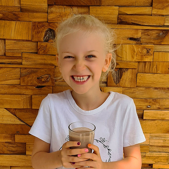 Mix the powder (see Dosage) with (soy) milk, yogurt, or anything else your child likes. Mix well in a shaker cup or blender.